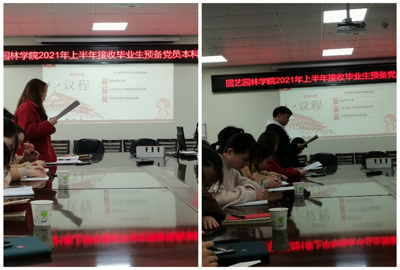 本次支部大会议程主要包括发展对象汇报、入党介绍人介绍情况并发表意见、正式党员进行无记名投票三部分。发展对象刘胜芳、杨鹏明宣读入党志愿书,从自己的入党动机、本人经历、思想状况、学习工作情况等方面进行了汇报;入党介绍人介绍发展对象的基本情况并发表意见,党支部成员根据发展对象的汇报情况和入党介绍人的意见展开充分讨论;最后支部正式党员通过无记名的投票方式进行投票,发展对象刘胜芳、杨鹏明均以16票全票通过。