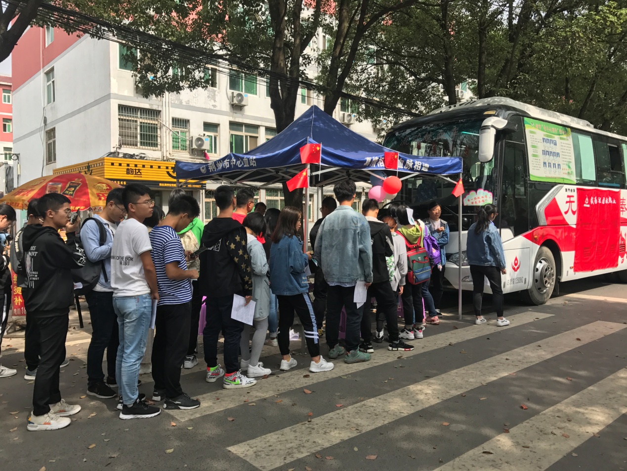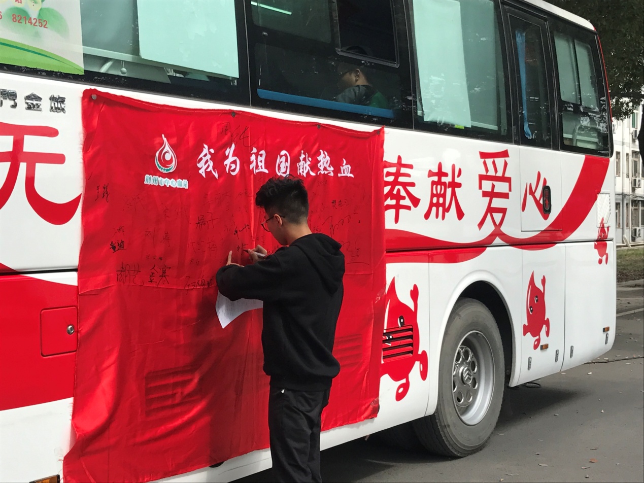 上午8时,一切准备工作就绪,大家热情迎接了荆州市中心血站工作人员的到来,在志愿者与血站工作人员进行细致交流后,献血活动有条不紊地启动。献血同学在志愿者们的引导下依次来到献血车进行信息登记、血液类型检验、静脉采血等,伴随着宣传区首首爱国歌曲的播放,在志愿者和献血者的感染下,路过的很多同学纷纷拿着小国旗排起了等待献血的长队。
