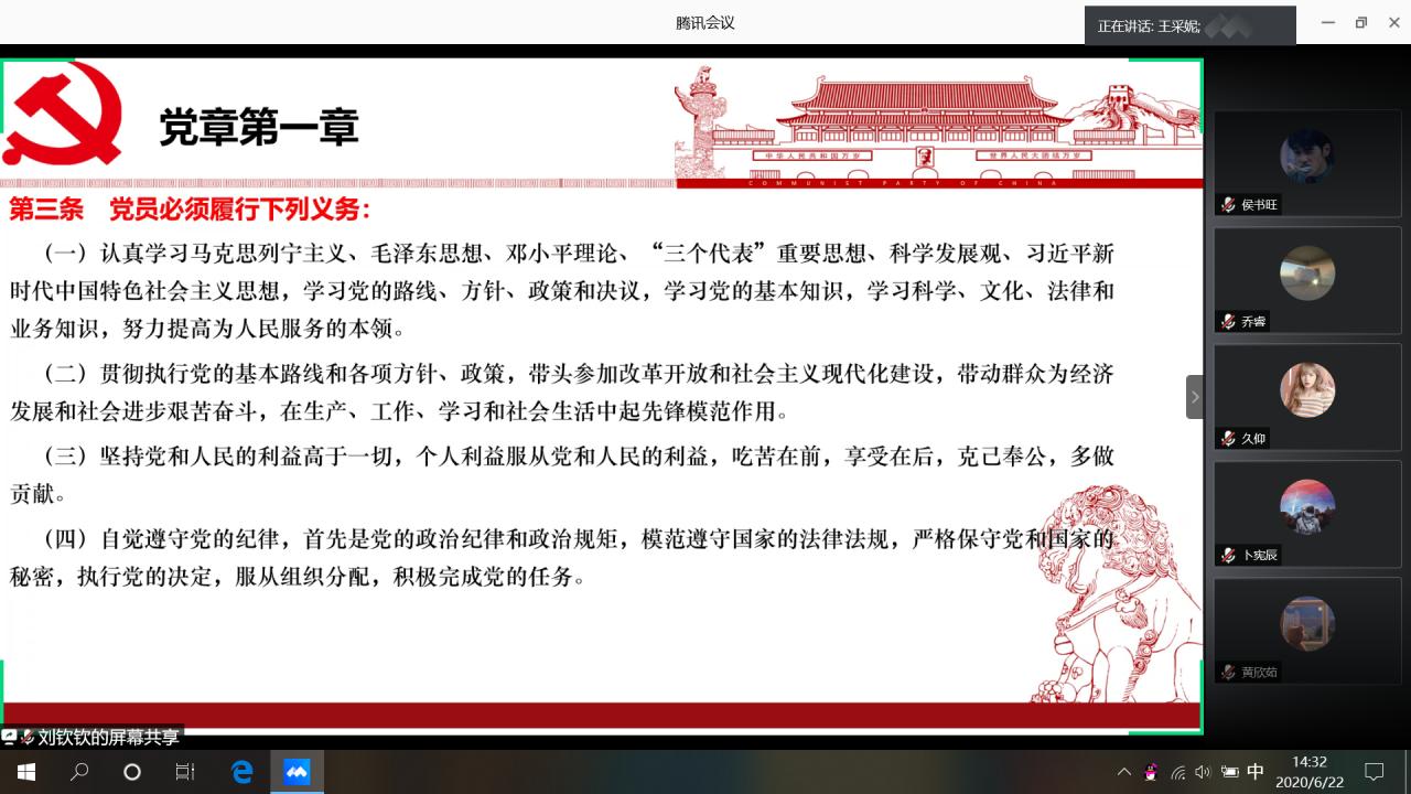 (通讯员:刘钦钦 王采妮)2020年6月22日下午2:30,betway必威中国本科生党支部通过腾讯会议的方式开展六月主题党日活动,支部书记彭文秀出席了会议,全体党员准时到会,会议由刘钦钦和王采妮同志主持。