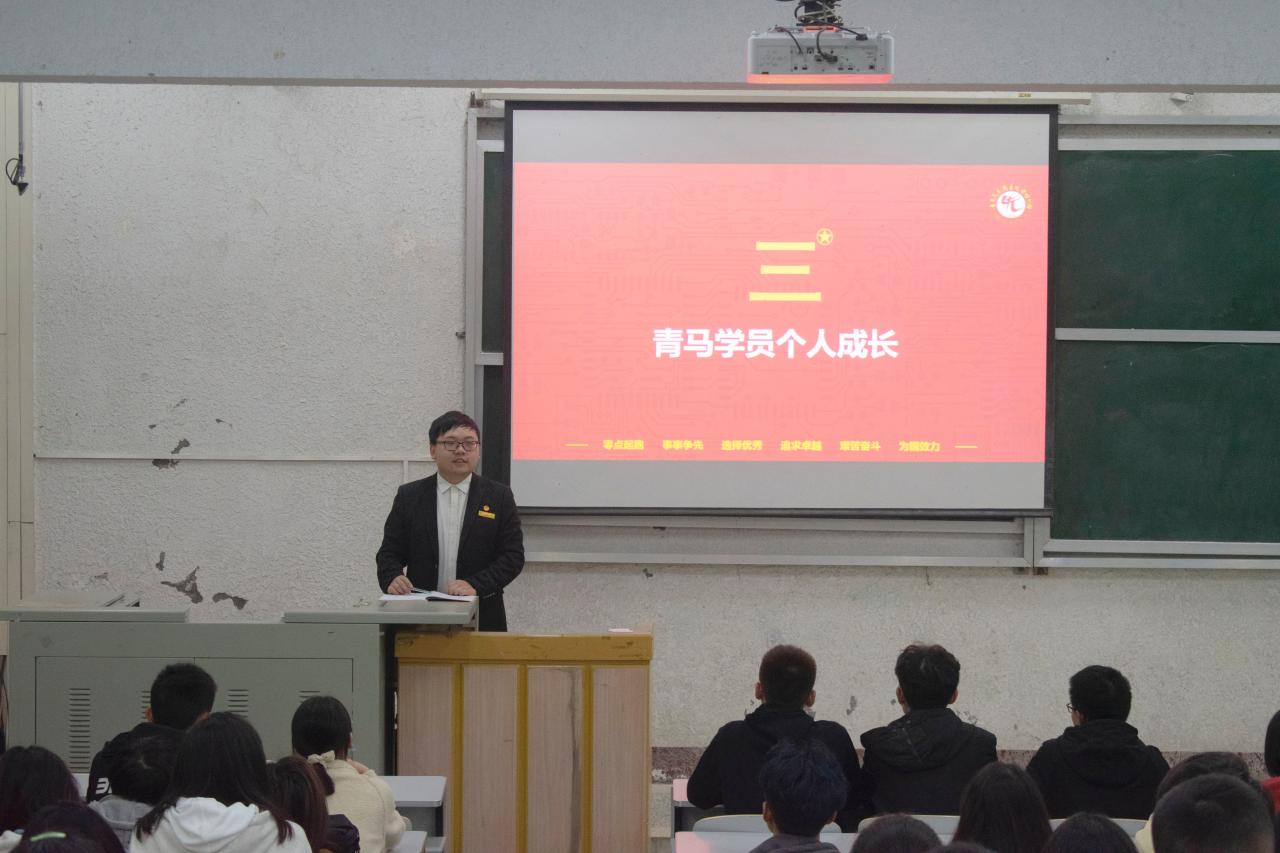在会上,主讲人王淏林围绕青马班核心文化、基本理念、思想要求等方面进行了详细的讲解。首先,他详细介绍了青马班学员的遴选条件与流程,同时也通过视频图片展示了青马班学员积极的精神面貌。其次与同学们交流了他在青马班的个人成长收获,他说:"努力做到思想上有信仰,学习上有进步,同学中有群众基础,是青马班每一位同学的目标,在青马班你会收获更大的平台,拥有更多的机会去实现人生的追求与理想。”让同学们对青马班有了更深刻的了解。最后他就参会的员工干部的问题进行解答并给予建议,希望各位同学可以加强自身信念,坚定政治立场,认真学习马克思主义,成长为一名合格的社会主义新青年。至此,本次青马班宣讲活动圆满结束。