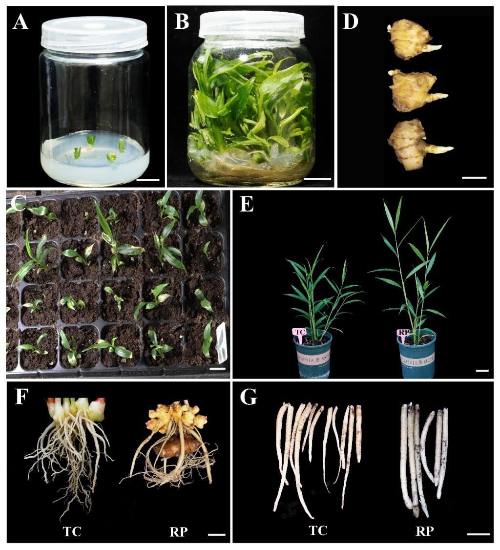 图1 生姜组培苗繁殖植株与传统姜块繁殖植株的建立与生长表现