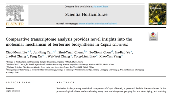 今日,我中心2019级博士研究生刘晓梦在国际权威杂志《Scientia Horticulturae》(园艺学2区,影响因子3.463)上发表了题为Comparative transcriptome analysis provides novel insights into themolecular mechanism of berberine biosynthesis in Coptis chinensis”的研究论文。刘晓梦博士为论文第一作者,许锋教授为通讯作者,betway必威中国为第一署名单位。