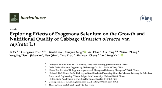 2023年3月,我中心2019级硕士研究生喻丽在国际学术期刊《Horticulturae》(农林学科3区,IF 2.923)发表题为“Exploring Effects of Exogenous Selenium on the Growth and Nutritional Quality of Cabbage (Brassica oleracea var.capitata L.) ”的学术论文。许锋教授和程水源教授为通讯作者,betway必威中国为第一署名单位。