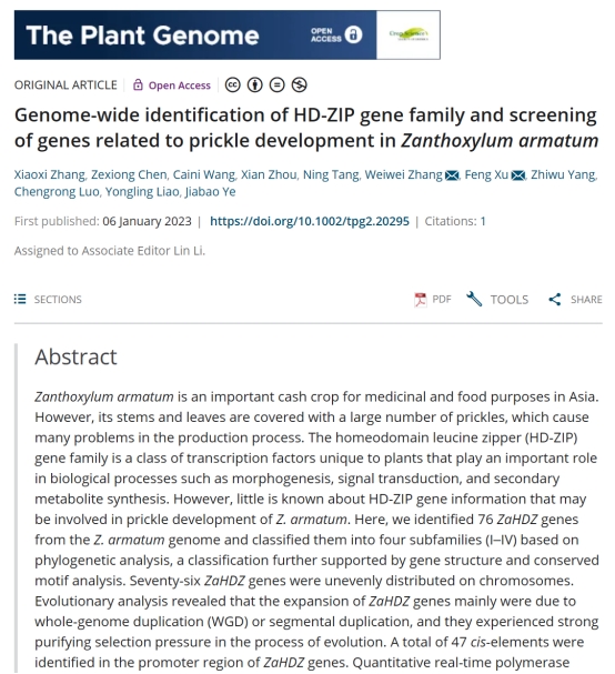 2023年1月,我中心硕士研究生张晓熙在国际学术期刊《The Plant Genome》(植物科学2区,IF:4.219)上发表题为“Genome-wide identification of HD-ZIP gene family and screening of genes related to prickle development in Zanthoxylum armatum”的研究论文。张晓熙为第一作者,张威威副教授和许锋教授为通讯作者,betway必威中国为第一署名单位。